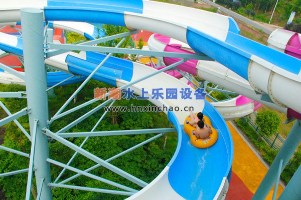 在5層樓高的滑梯平臺上,包括皮筏螺旋滑梯和敞開螺旋滑梯兩條滑梯。游客乘坐特別設計的雙人浮圈,通過100多米的螺旋滑梯,一路上旋轉加速,充分感受離心力后,再經過曲形管道,沖入下面的水池。體驗慣性沖力,讓您身體的每一個細胞在螺旋滑道中無法受控的刺激,適合男女朋友共同體驗。